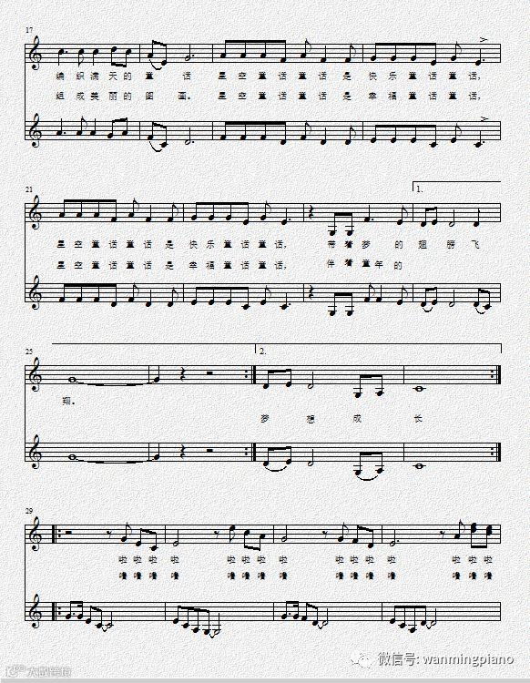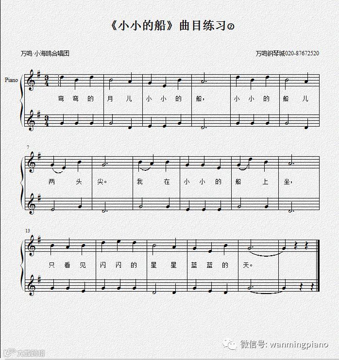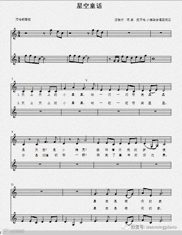 3、带歌词的演唱旋律,面带微笑有感情的演唱歌曲,想象出一幅有蓝蓝的天、弯弯的月亮、闪闪的星星 的美丽画幅。