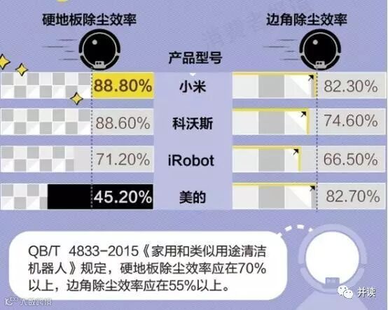 可以看到,新国货小米遥遥领先,无论是硬地板还是边角除尘,都有80%以上,远高于国家的标准。其次是科沃斯,仅仅是边角除尘比小米逊色。接着是大牌iRobot,也是在国家标准之上。比较可惜的是美的,尽管边角除尘效率非常好,但是硬地板除尘效率竟然不达标。