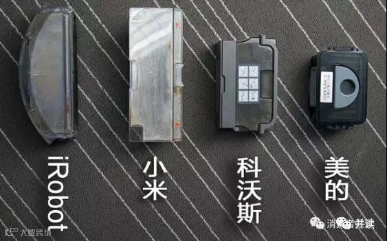从上图可以看到,小米的尘盒是最大的,其次是iRobot,科沃斯和美的小不少。或许这个设计也影响到前面提到的除尘效率。毕竟地板除了灰尘,还会有一些纸屑和毛发丝之类的物体,尘盒越大,意味着能扫进去的东西越多。