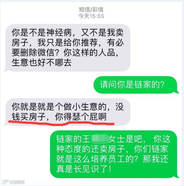 跳价是对购房者情绪上造成恐慌,而个别中介,更是对购房者直接进行羞辱。据信网报道,一位青岛购房者,在不堪其扰删掉了一名链家经纪人的微信后,竟然被对方发来短信辱骂嘲讽:没钱买房子,你嘚瑟个屁啊!