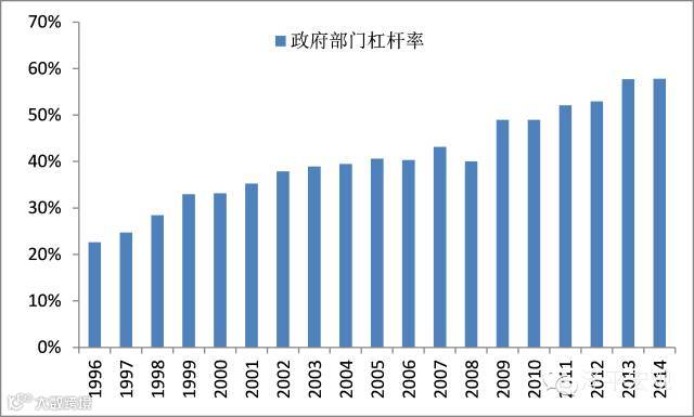 截止2014年末,整个政府部门债务已达36.8万亿,占GDP比重为57.8%。2008年金融危机后,政府部门的杠杆率出现了快速上升,2008-2014年期间增加了17.8%。