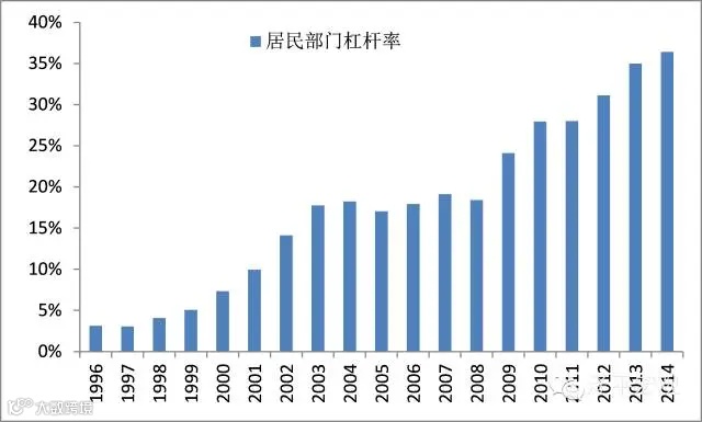 由于居民不能发行个人债券,所以居民部门的债务全部是贷款。我们根据央行公布的金融机构本外币信贷收支表,截止2014年末,居民部门负债23.2万亿。其中,消费性贷款15.4万亿,经营性贷款7.8万亿,占2014年GDP比重为36.4%。2008年金融危机后,居民部门的杠杆率出现了较快的上升,2008-2014年期间上涨了18%,居民债务增长主要来自于住房按揭贷款的增长,其次,来源于汽车贷款和信用卡贷款。