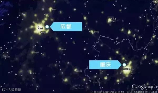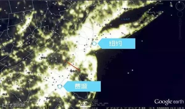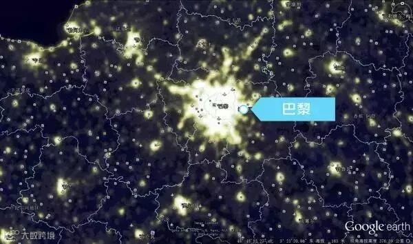 下面是 Google Earth 的夜间卫星图,可以近似地把灯光视为城市,没有灯光微弱的地方视为农村或者其他非城市地区。比例尺都一样,都是卫星在 377.53 公里的视角下的卫星图。