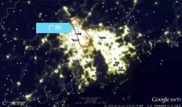 仔细看,写着广东省三个字的地方实际上大概是广州市越秀区省府所在区,佛山和广州的灯光已完全一体。广州的城市形态是由北往南的细条,红圈内大概就是花都到番禺一线;南沙区没有圈进来,在灯光稍微弱一点的地方;广州东面、东莞之间的广州新黄埔区也没有画进红圈,但也是亮灯的。整个广州市可以说都是灯火通明的了。其实东莞、惠州、深圳、珠海、江门一直到香港的灯光都完全一体了。