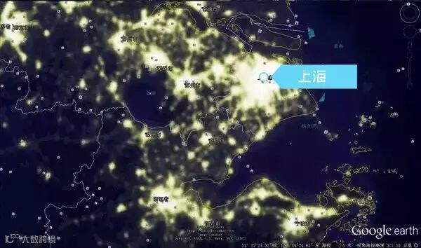 可以看见,上海和西北方向的江苏省的太仓、昆山通过稍弱的光亮连接在一起,上海的西北边界已经被灯光掩盖了。虽然上海市面积不如北京大,但是可见上海的灯光所占比例却是大于北京灯光的比例的,已快填满整个上海市。