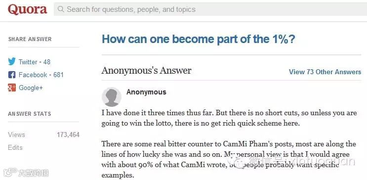 本文是Quora上关于 How Can One Become Part of the 1%?问题的高票回答,截止本次推送,已获得超过17万次的浏览和3000多个赞。作者匿名,据其所述,80年代从中国来到美国,21岁自己买了第一套公寓,大学没毕业、离婚、炒股失败、开设过自己的对冲基金、尝试过自杀、儿子患有罕见的血液疾病,三十多年间经历三次大起大落。他告诉你:连比尔.盖茨都有屎一样的日子,你要像傻逼一样学会花钱,很多时候快乐和放下身段就是生意是否成功的关键,你的人生就是你对抗全世界!