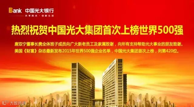 进入世界500强,这是全世界每个企业的梦想。但谁也想不到的是,八年前濒临破产的中国光大集团,竟然八年后进入了世界500强。7月22日晚,美国《财富》杂志发布的2015年世界500强企业名单里,中国光大集团首次上榜,名列第420位。8年之间,这一巨大反差,对于光大来说,着实来之不易。