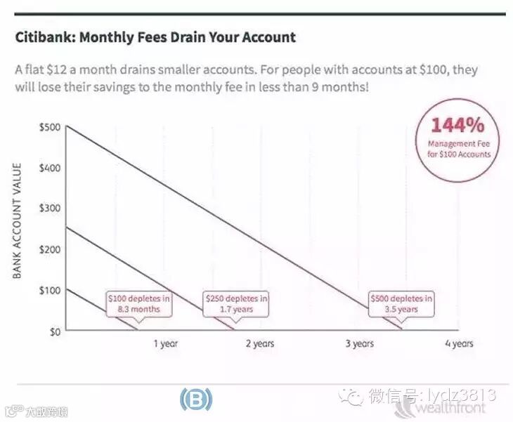 如果你开通一个 100 美金账户,一年内,他们就能非常有效地收取你原始存款的 144%。实际上,你甚至都做不到存款一年,因为 9 个月不到,银行就会把你存入的 100 美元,全部作为“服务费”收走。