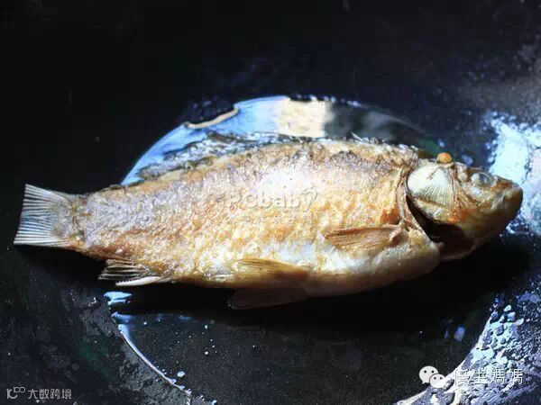 步骤4:锅烧热加油,放入姜、鱼,煎至鱼身成微黄色。