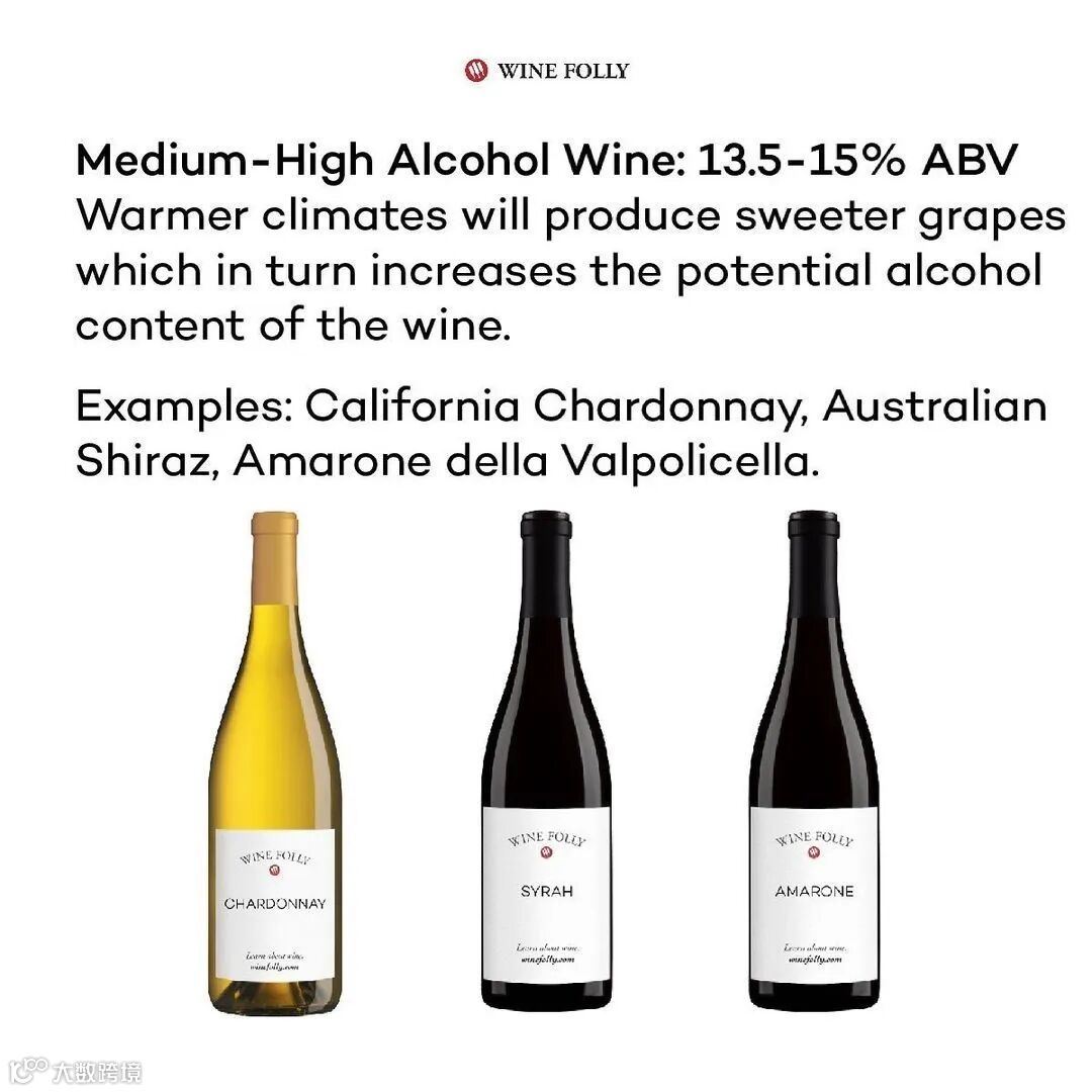 酒精含量较高的葡萄酒往往口感更浓烈、更油滑圆润。