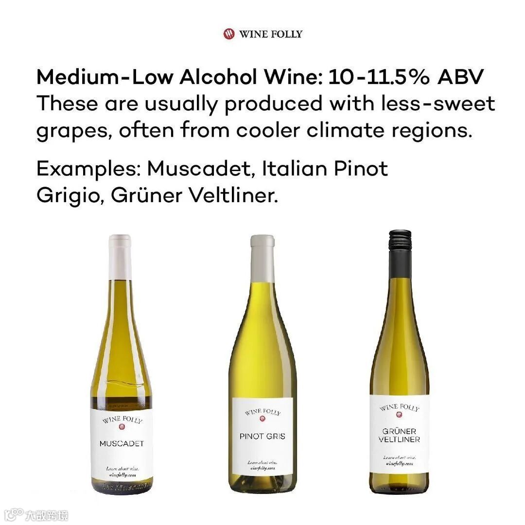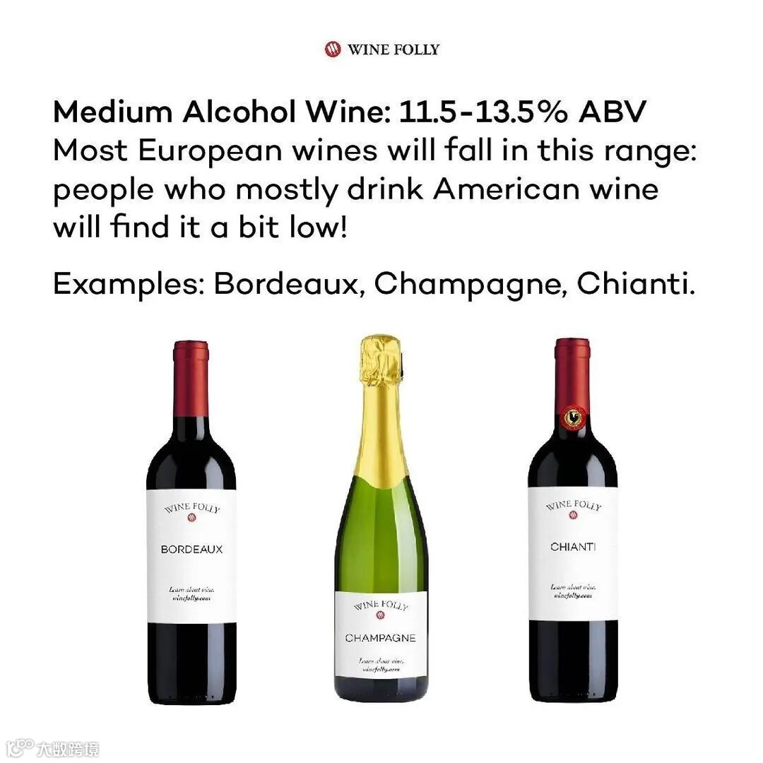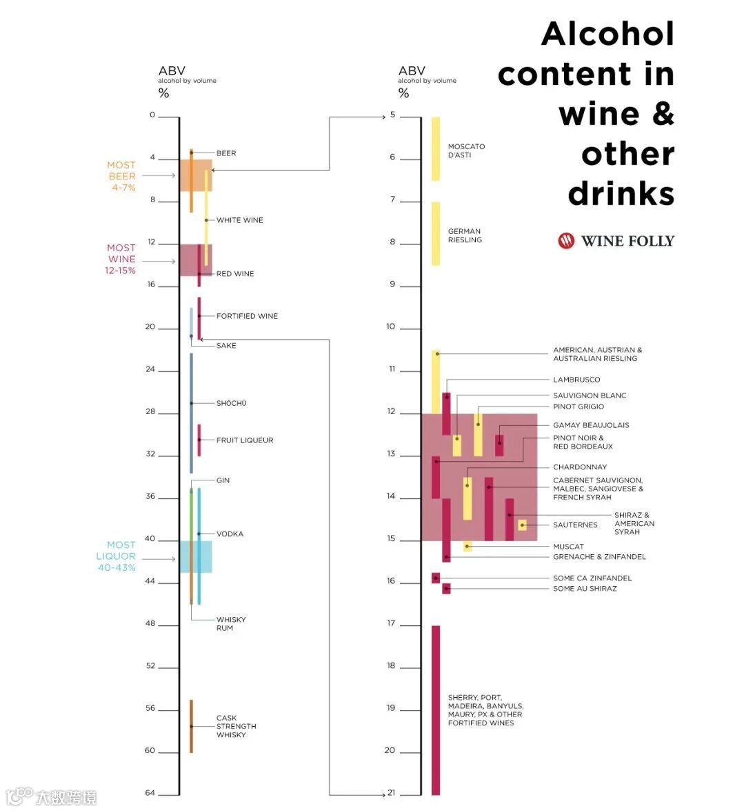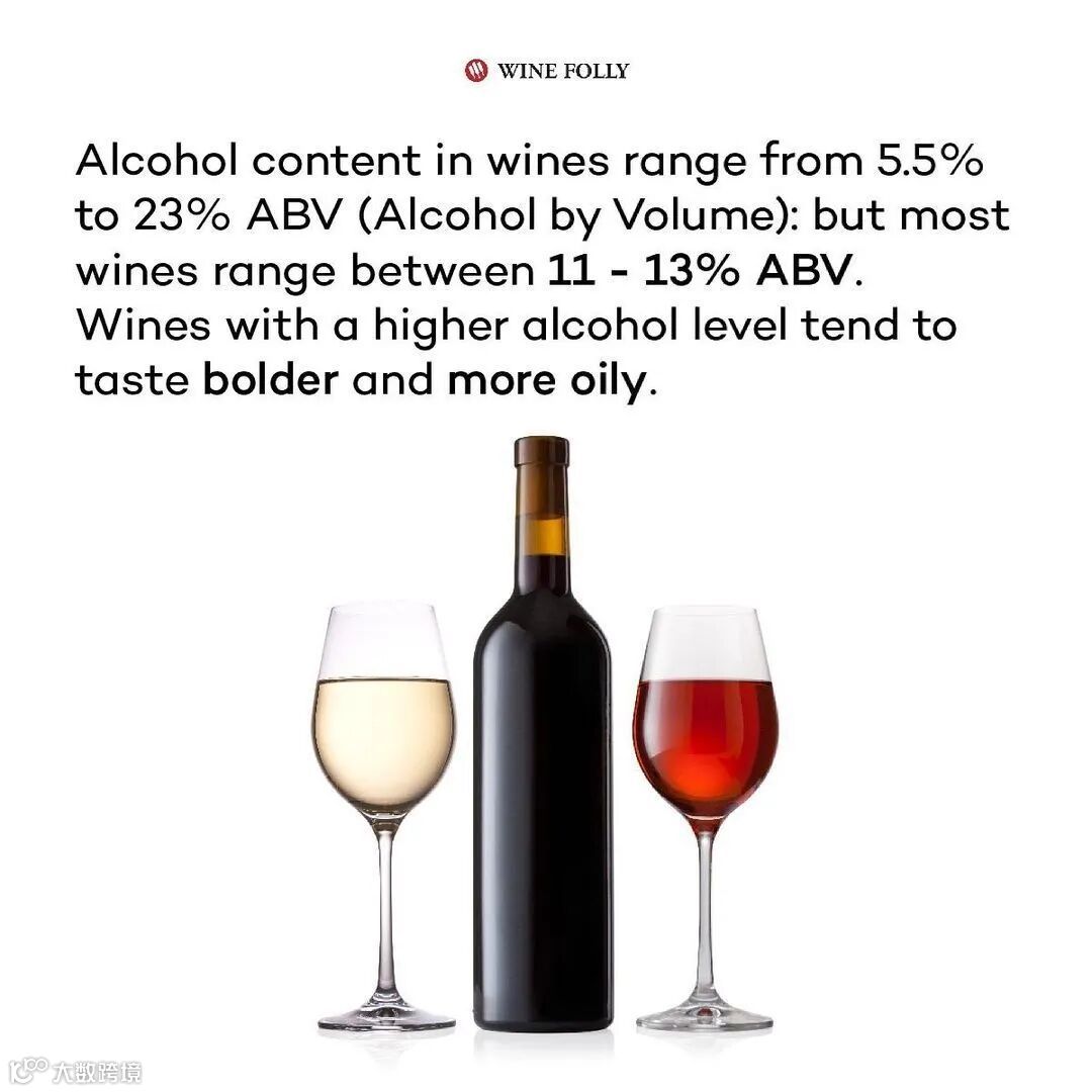 葡萄酒中的酒精含量从5.5%到23%:但大多数葡萄酒的酒精度在11-13%之间。