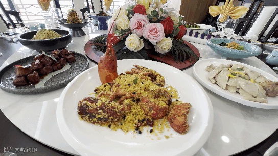 主菜:白切正宗走地鸡、葱油蒸野生老鼠斑、港式避风塘大波龙、大连鲜鲍扣野菌、海盐烧牛脷、黑胡椒蜜烤牛肋骨、秘酱葱烧婆参、冰镇脆皮黑毛猪咕噜球、樱花虾香煎紫山药、上汤浸时蔬