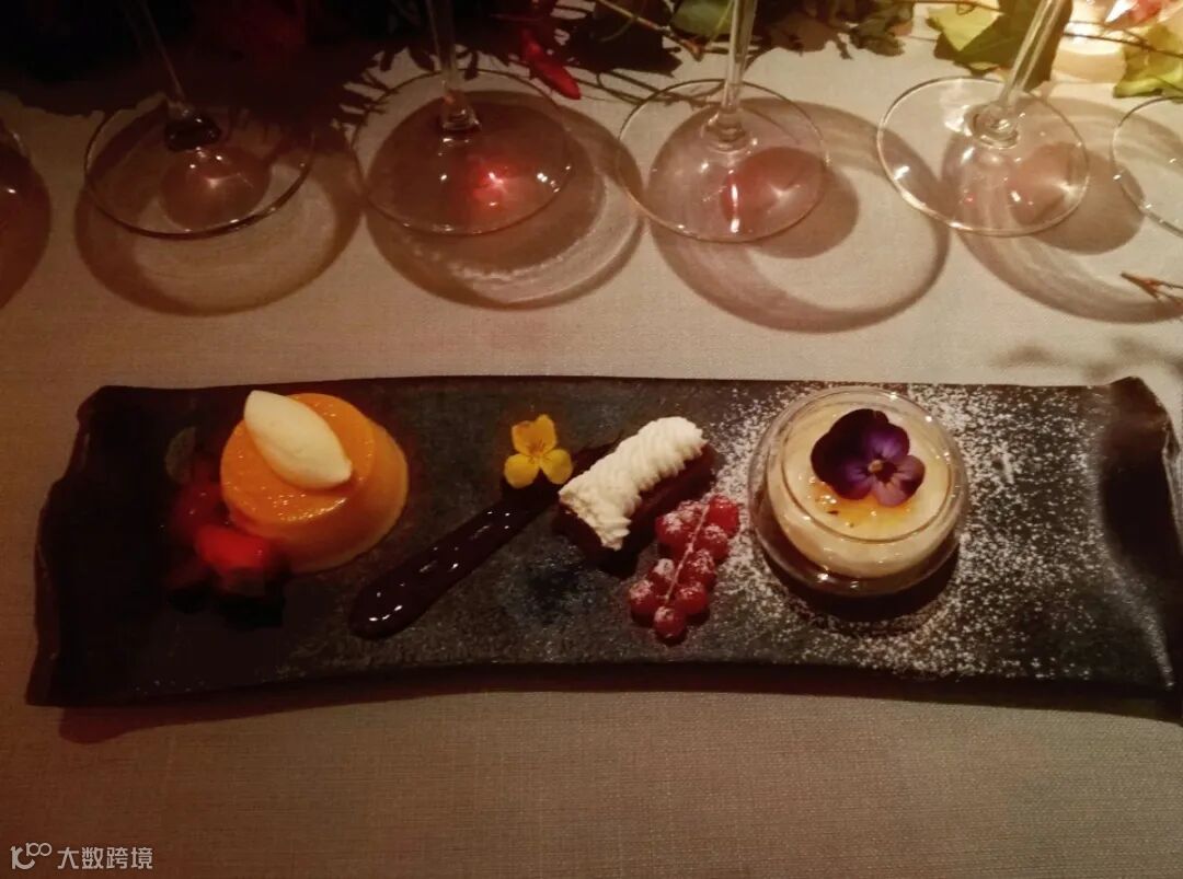 最后是甜点荟萃,焦糖布丁,奶酪紫薯,白玉米炖牛奶。Chef Martin这样解释,他将三个地理位置融合在最后一道菜中。在阿根廷中部的布宜诺斯艾利斯市,有一种西班牙传统甜品——“蛋奶甜点(Flan)”,但这里配上了阿根廷最受欢迎的“Dulce de Leche”(焦糖奶油酱);在阿根廷西部,当地人们习惯把红薯做成甜果冻,和奶酪混合在一起;最后在北部,人们用具有深厚文化和美食价值的玉米来制作“mazamorra”。几个甜品,软糯而不甜腻,入口即化,很好的给今天的原汁原味阿根廷美食做了收尾,而与之搭配的甜白,也不争不抢,因为糖度只有50克,很好的突出了甜品适中的甜度。但又在甜蜜的环节里补充了一些丰富的水果香气。