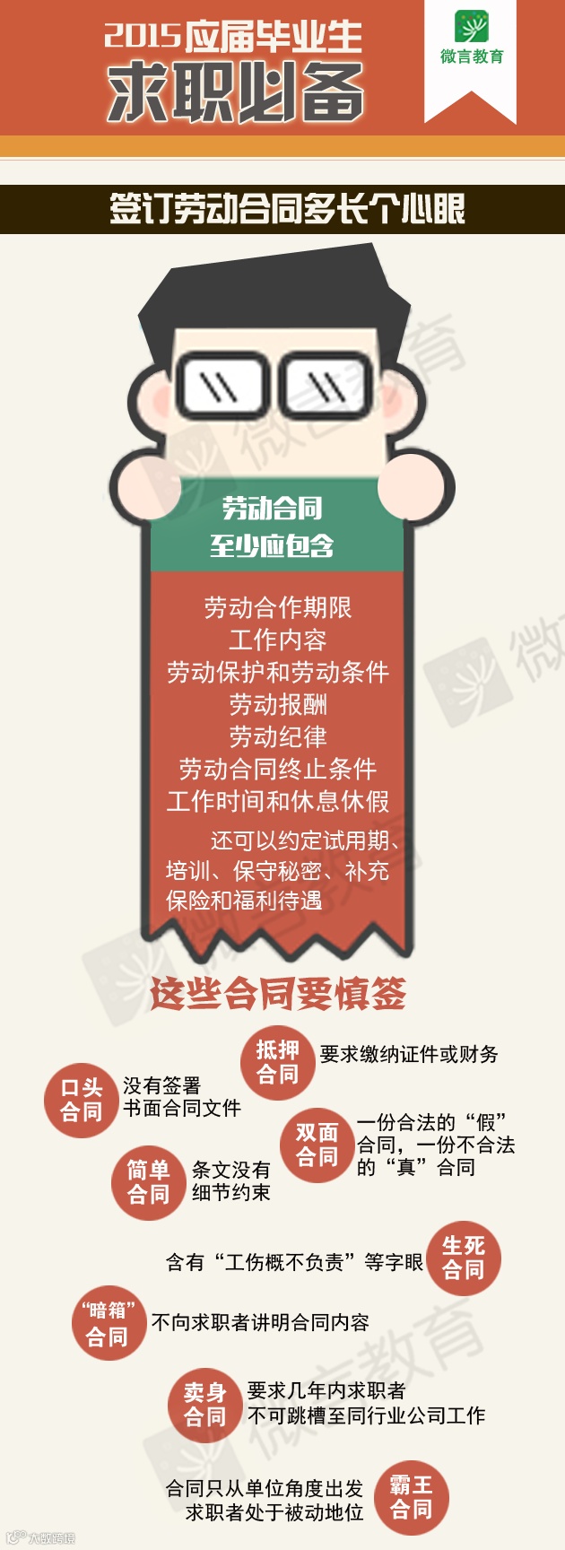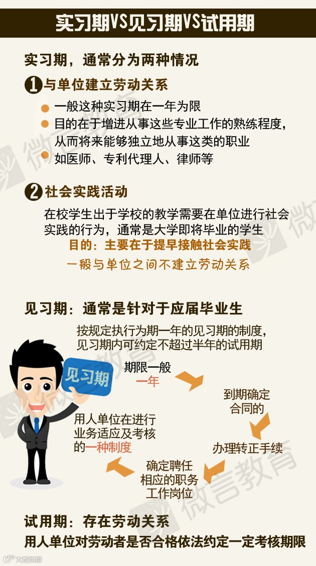 六月来临,即将毕业的同学们将走出校园,走进职场。小编特意制作了2015应届生求职必备的一张图,这里面包含了签订劳动合同注意事项,实习期、见习期、试用期之间的不同以及试用期维权注意事项,希望能给即将踏入职场的亲们带来一些帮助。