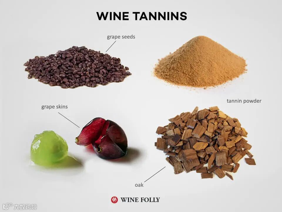 单宁主要来自葡萄皮和葡萄籽,皮厚的品种往往单宁较高:赤霞珠、內比奥罗、圣乔维塞、马尔贝克、慕合怀特、西拉、丹娜和丹魄都是高单宁的品种。