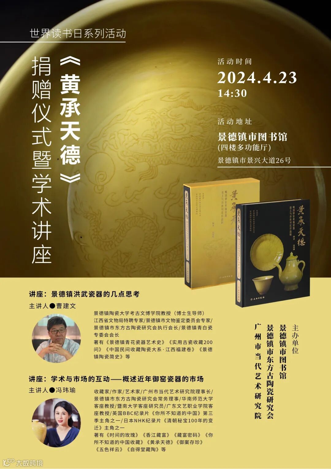2024年4月23日是世界读书日,在这个有特别意义的日子里,知名作家、艺术家、收藏家冯玮瑜向景德市图书馆及县区图书馆捐赠她的近作《黄承天德——明清御窑黄釉瓷器出土与传世对比珍品展》以及她编著的系列书籍,景德镇市图书馆并为此举办“《黄承天德——明清御窑黄釉瓷器出土与传世对比珍品展》及冯玮瑜编著系列书籍捐赠仪式”活动。