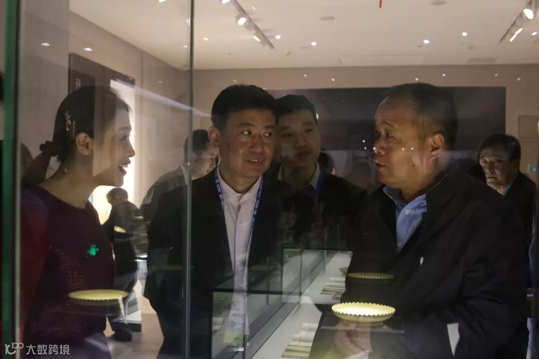 “黄承天德明清御窑黄釉瓷器珍品展”展览现场:景德镇市人民政府副市长熊皓(右一)景德镇市考古所所长江建新(中间)与冯玮瑜(左一)