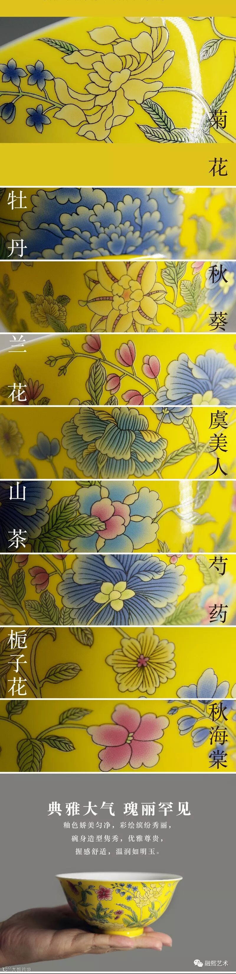 碗身以诸色粉彩全手工绘画牡丹、秋葵、菊花、兰花、虞美人、秋海棠、山茶、芍药、栀子花这九种秋天盛开的花卉,花枝招展,风姿绰约,洋溢着丰收喜庆的气氛,寓意九秋同庆,共贺丰收。