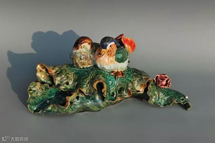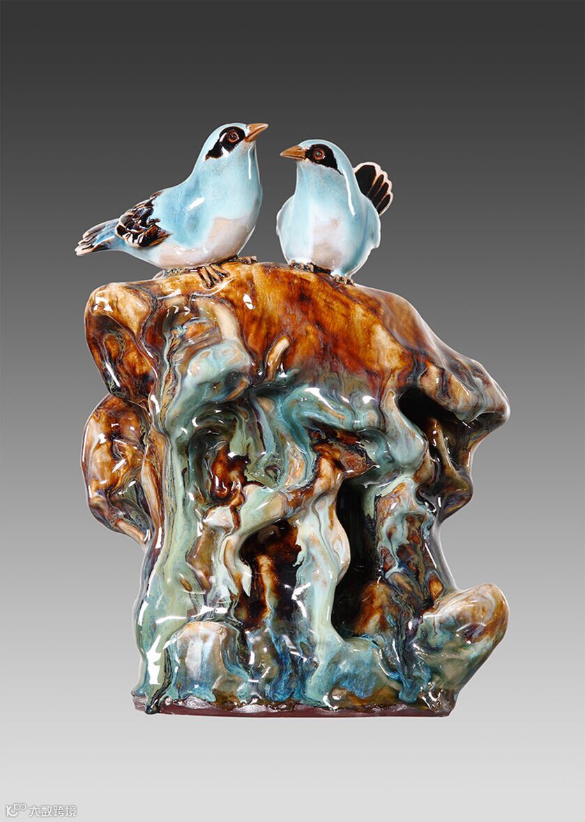 作品双鸟和鸣,釉色清新淡雅,寓意夫妻和谐。
