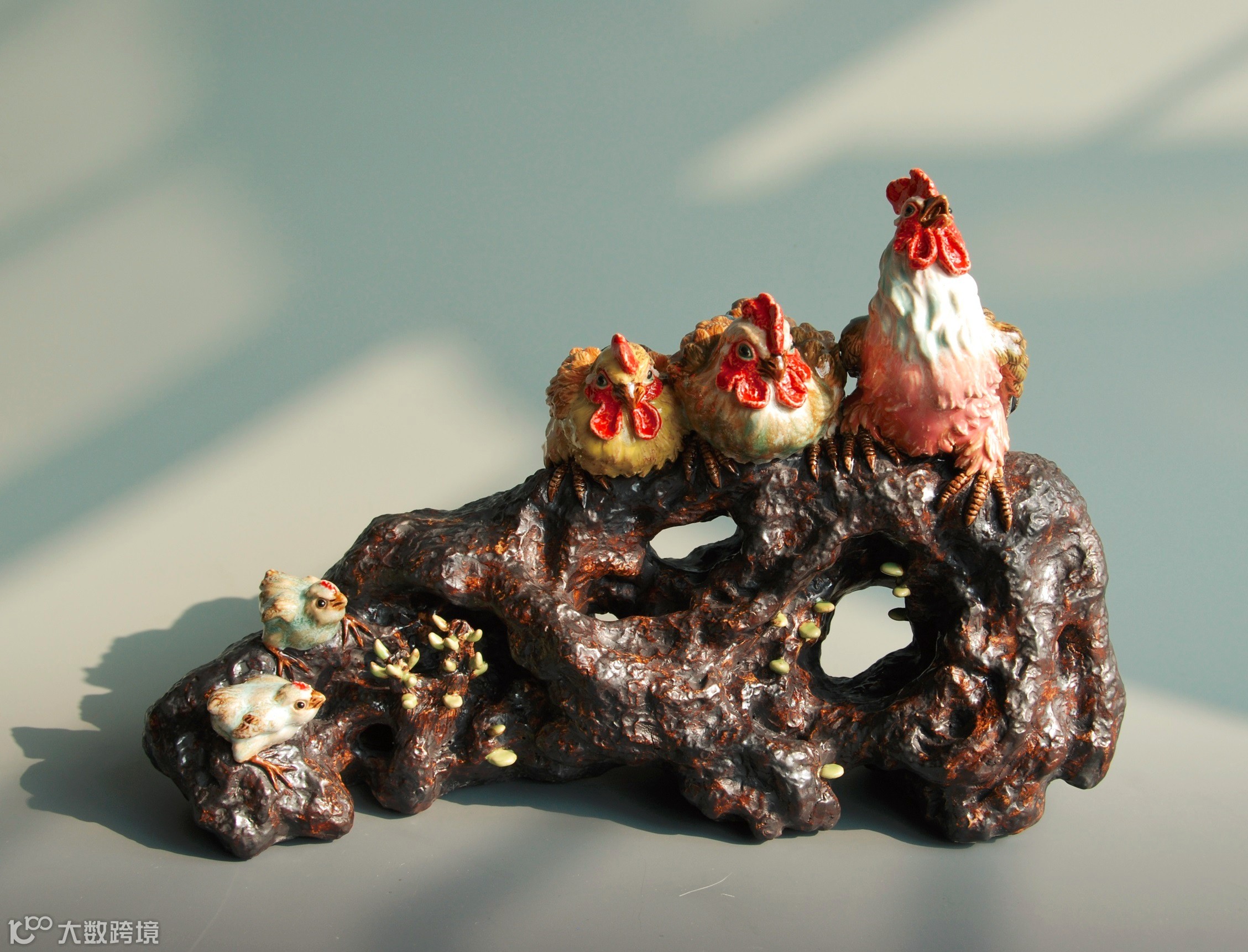 作品生动细致地刻画了“公鸡一家”匍卧在树干上的画面,公鸡昂脖打鸣,两只母鸡团卧于一侧,两只幼崽则无忧无虑的在一旁玩耍。整个作品给人一股安逸舒适中又透出生机勃勃的气息。