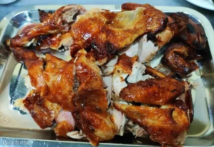 被烧得油光铮亮的鸡皮又酥又脆,撕开鸡皮汁水飞溅,肉质鲜嫩。