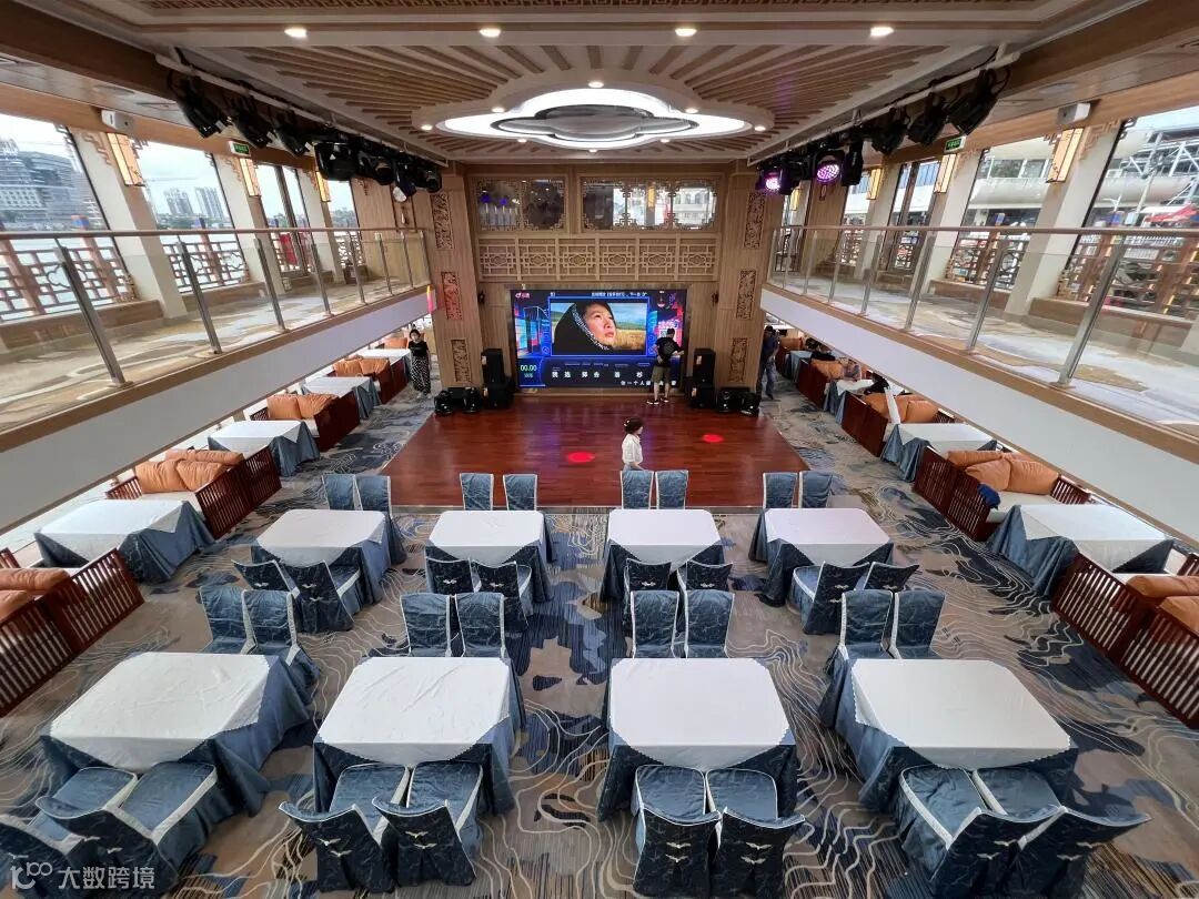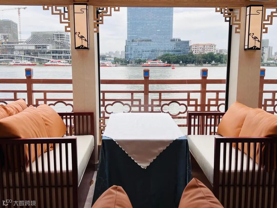 游船内部整体以黄色为主色调,中国特有的雕花、凤凰、山水等元素随处可见,搭配淡雅的蓝色地毯和椅套,细微之处尽显广府风情韵味。