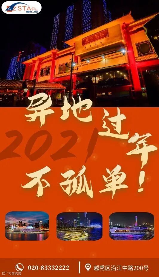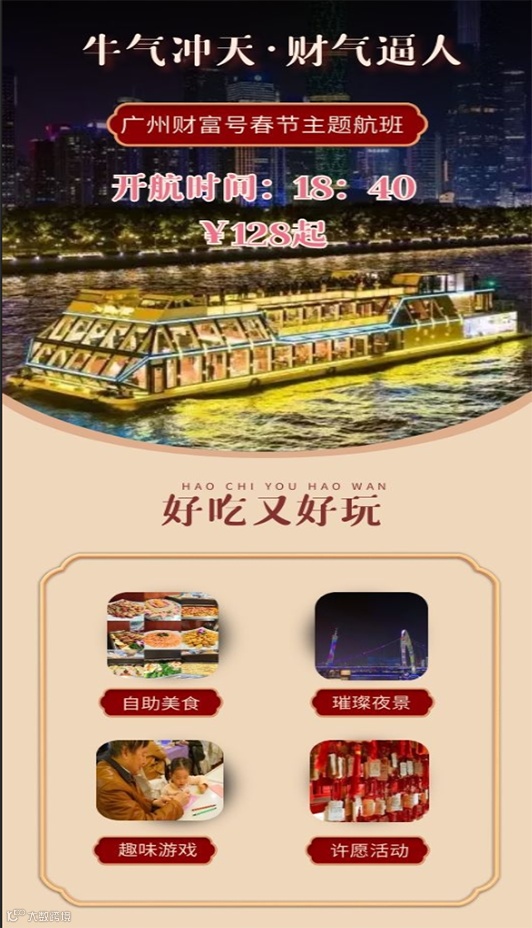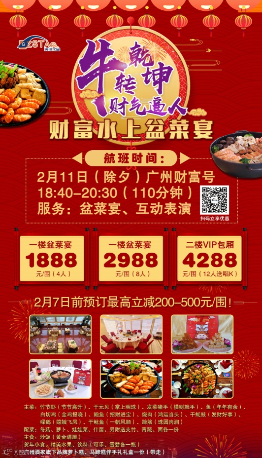 春节期间天字码头珠江夜游18:40起约10分钟一班船,广州塔精华游78元/人起。大年初五开始“珠水百年·水上茶居”航班每天8:30启航,叹茶、游船合家欢!