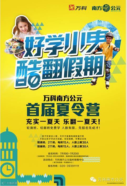 本周末开始,万科南方公元首届夏令营绘画班、轮滑班欢乐开班了!不用再怕孩子问起“我们去哪儿”、不用再害怕孩子暑假只在家里吹空调玩电脑……万科南方公元为你解答难题:在绘画班,让孩子勾勒出心中的世界;在轮滑班,给孩子放飞梦想的翅膀……