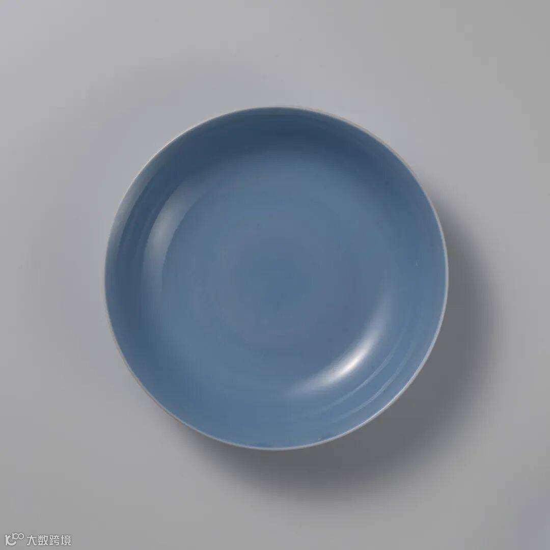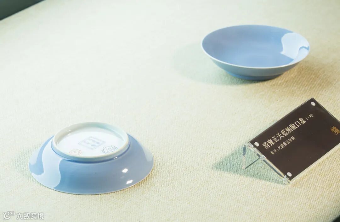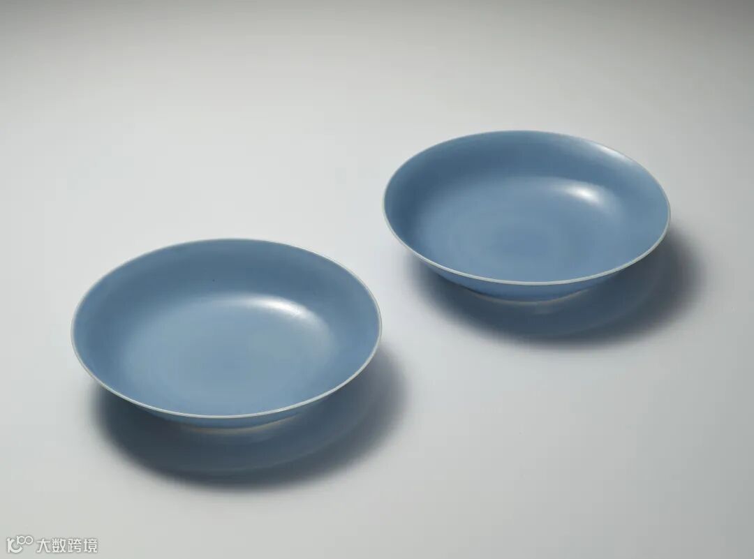 盘成对,造型简洁端庄,胎体薄厚均匀,底足修饰浑圆规整, 体现出雍正一朝高超的制器水准。内外壁通施天蓝釉,釉层匀 净,釉色静谧,宛若秋日晴空。款识字体端正隽秀,为雍正御 窑瓷典型书款字体。