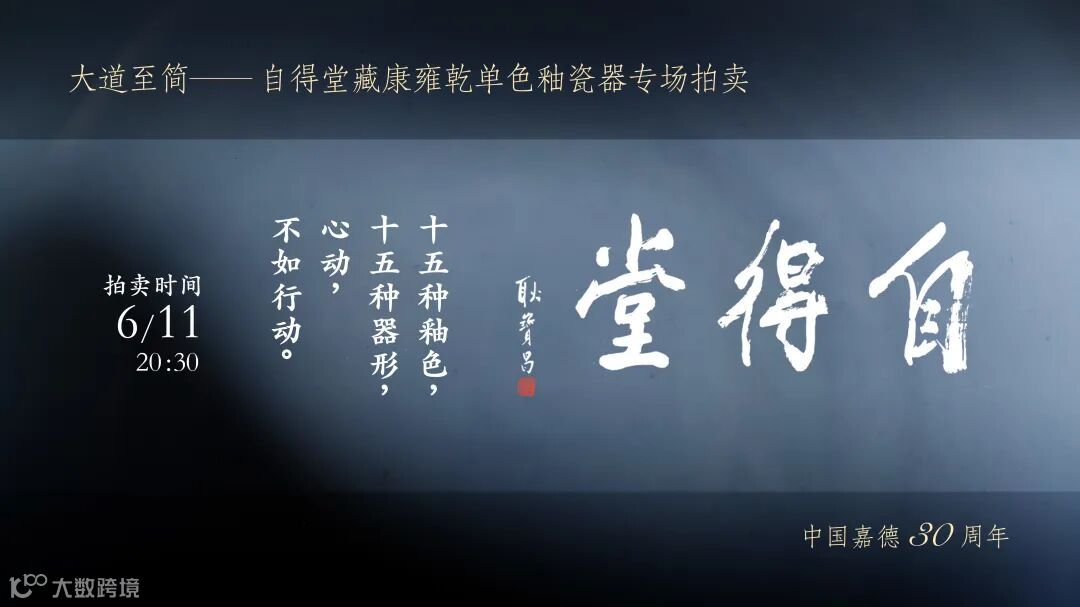 6月11日晚上20:30,自得堂主人冯玮瑜在中国嘉德30周年首次推出《大道至简——自得堂藏康雍乾单色釉瓷器》专场。