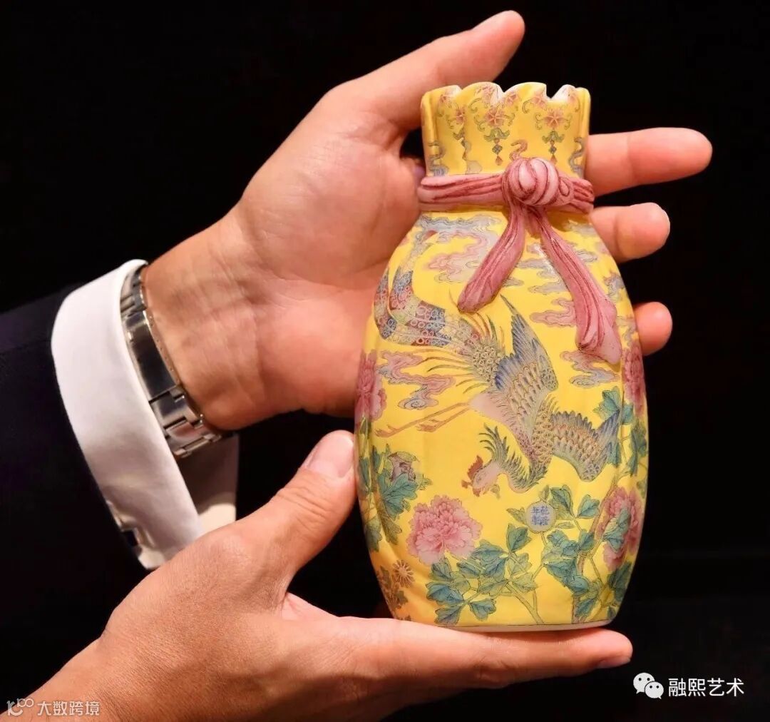 2019年香港苏富比秋拍,一件以黄釉作底色的黄釉珐琅彩瓷器——清乾隆料胎黄地画珐琅凤舞牡丹包袱瓶以连佣2.07亿港元成交!