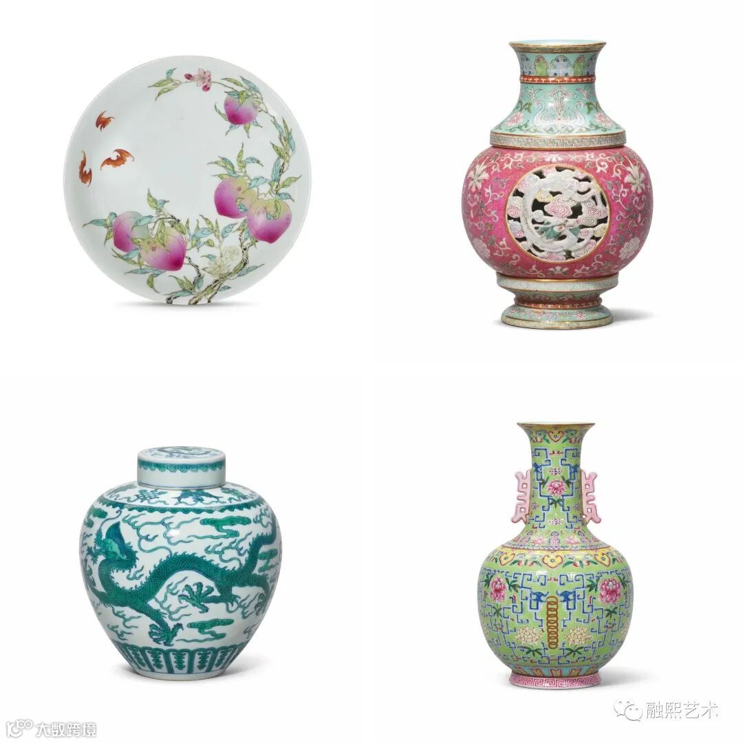 部分拍品:清雍正粉彩过枝福寿双全盘、民国粉彩镂空云龙纹转心瓶、清道光绿彩云龙八宝纹盖罐……