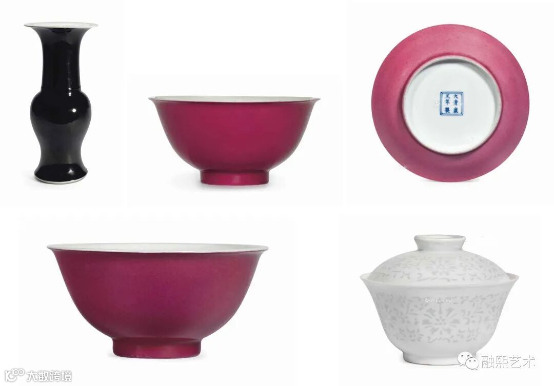 左起:清康熙乌金釉凤尾尊、雍正胭脂红釉碗、雍正淡粉釉盘;雍正胭脂紫釉碗、乾隆白釉玲珑盖碗
