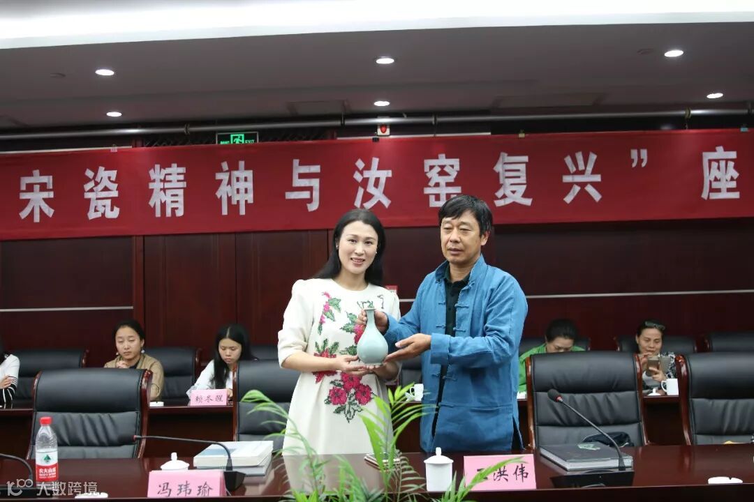 河南省工艺美术大师王国奇把自己烧制的汝瓷作品赠送给冯玮瑜