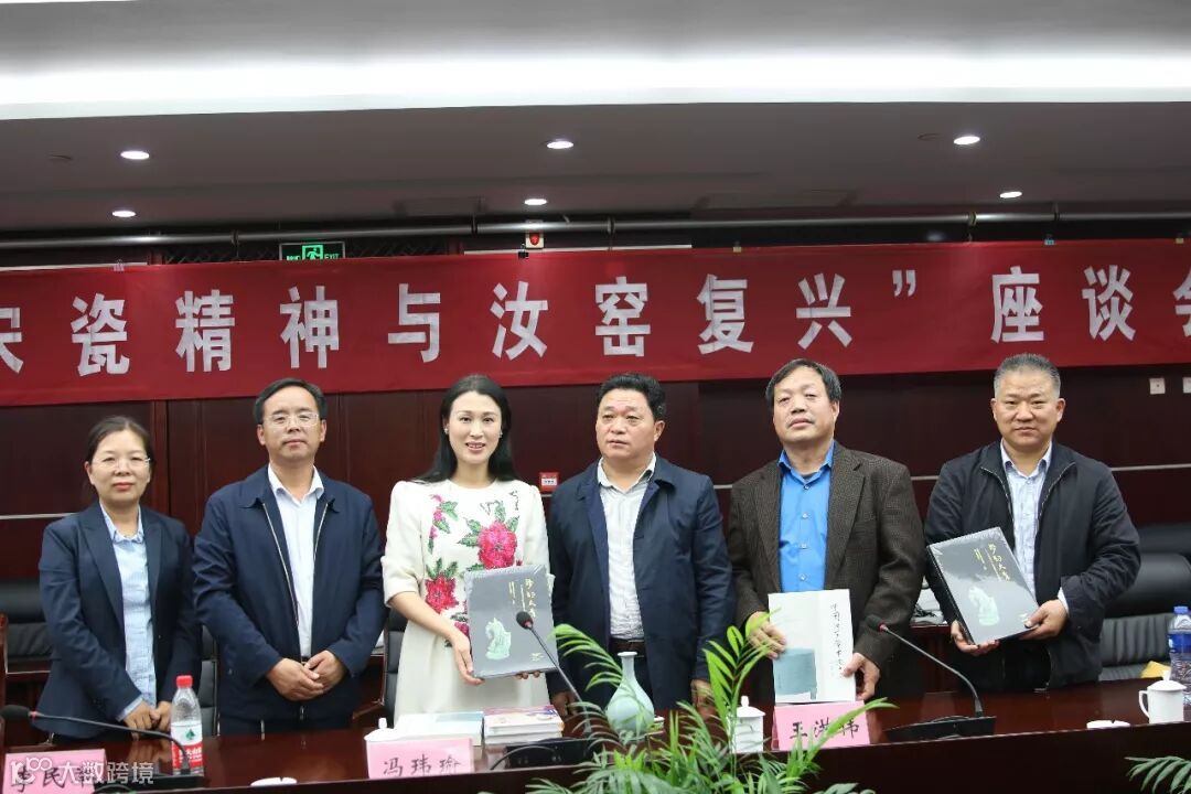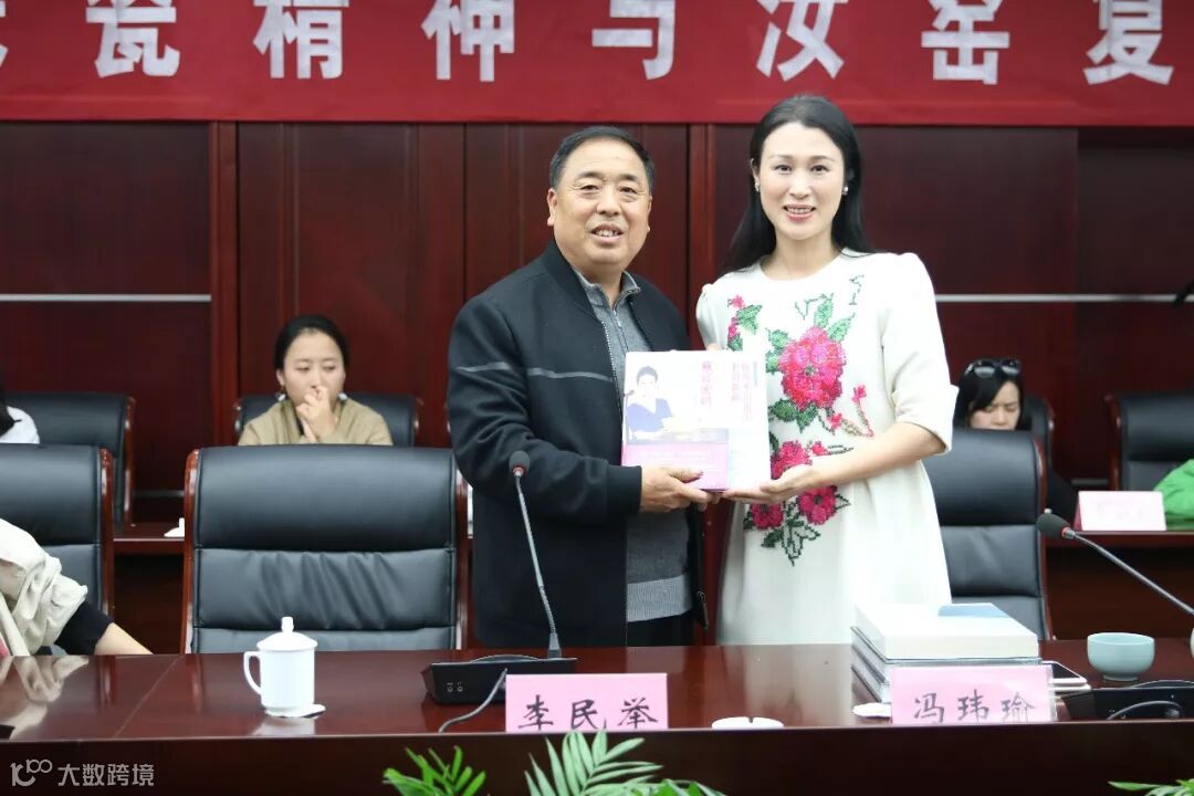 宝丰县人大常委会副主任阿卫国、宝丰县重点项目工作领导小组副组长郜现营、宝丰县汝窑瓷业保护和发展中心主任吕艳慧与融熙学游创始人冯玮瑜互赠书籍