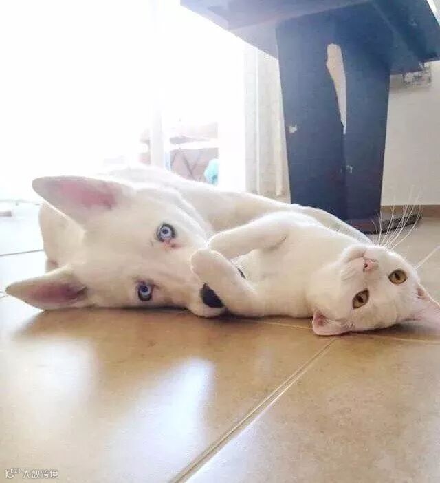 包子很喜欢模仿小白的睡姿。