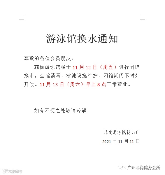 菲尚游泳馆将于11月12日(周五)进行闭馆换水,全馆消毒,泳池设施维护。闭馆期间不对外开放。11月13日(周六)早上8点正常营业。