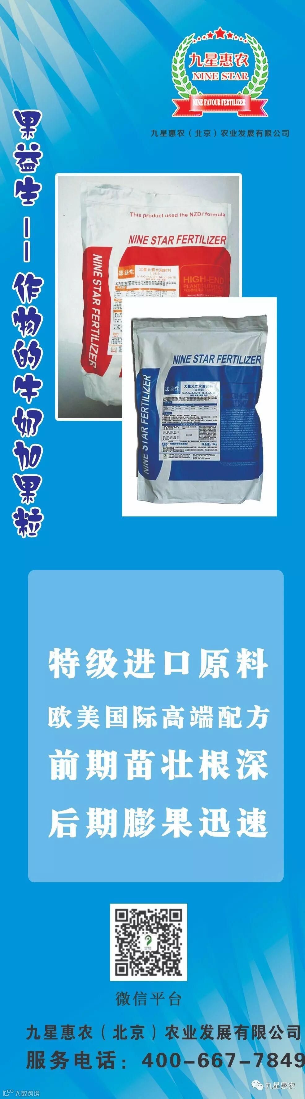 九星惠农果益生高端植物营养配方一次补足作物所需大量元素以及作物易却的中微量元素,九星惠农果益生高端植物营养配方,主要遵循欧美国家高端植物营养产品配方式的要求研究,完全符合无公害产品,绿色农产品以及有机农产品对肥料的严格要求。
