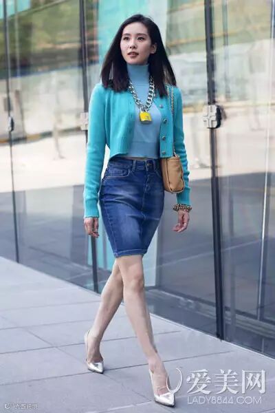 示范搭配:蓝色高领毛衣+蓝色针织开衫+牛仔包臀裙+银色尖头高跟鞋+链条包+锁头项链