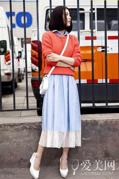 示范搭配:浅蓝色连衣裙+橘色套头毛衣+白色斜挎包+白色尖头鞋