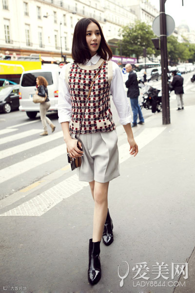 示范搭配:白衬衫+针织马甲背心+灰色五分裤+黑色尖头短靴+斜挎包
