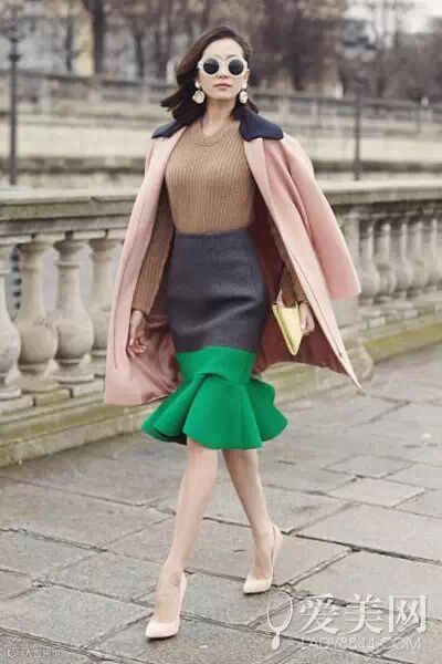 示范搭配:驼色羊绒衫+鱼尾摆拼色毛呢半身裙+裸色尖头高跟鞋+粉色毛呢大衣+手拿包+太阳镜