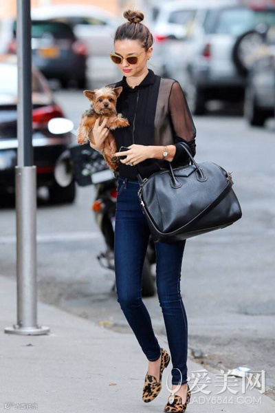 搭配要点:黑色透视上衣+紧身牛仔裤+豹纹平底鞋+黑色手提包