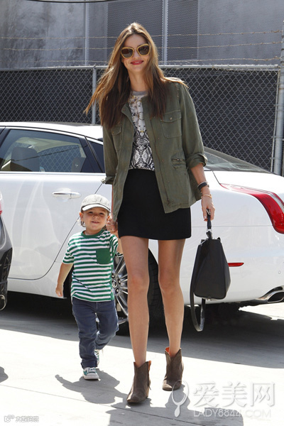 搭配要点:军绿色外套+印花里衣+黑色短裙+黑色手提包+棕色踝靴