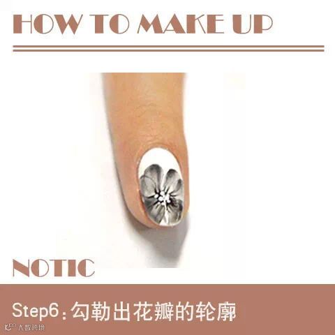 Step6:用毛笔蘸取稀释过的黑色甲油胶,勾勒出花瓣的轮廓。然后蘸取黑色甲油胶画出花芯,用波点笔蘸取白色甲油胶点出花蕊。
