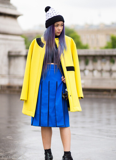 LOOK9:亮黄色大衣+黑色打底衫+蓝色百褶裙+波点针织帽+黑色厚底短靴