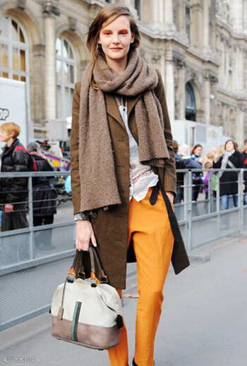 LOOK5:咖啡色大衣+白色衬衫+驼色围巾+橘黄色直筒裤+拼色手提包+黑色短靴