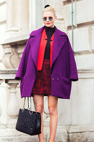 LOOK4:紫色大衣+红色短款外套+黑色打底衫+混色包臀裙+黑色链条包+圆框墨镜+白色高跟鞋