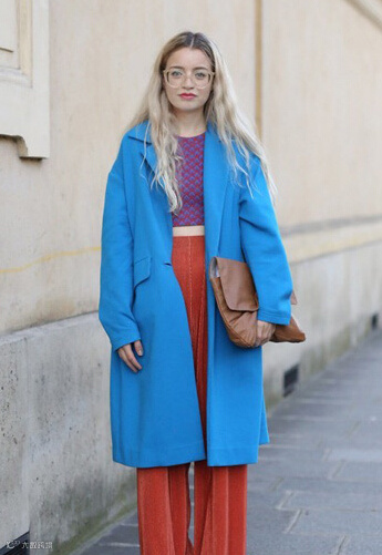 LOOK8:蓝色大衣+紫色短款上衣+橘红色阔腿裤+棕色手拿包
