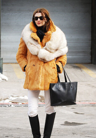 LOOK2:姜黄色皮草外套+米白色皮草披肩+米白色紧身裤+黑色长筒靴+黑色手提袋+黑色墨镜